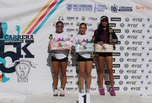 Entre tanto, en la rama femenil, Nallely vino desde Cuauhtémoc, Chihuahua para imponerse con una marca de 19 minutos y 05 segundos, dejando en segunda posición a Ana Victoria Machuca que hizo un tiempo de 19.53 segundos, y completó el podio de ganadoras Fritzy Cota con 20 minutos y 53 segundos.